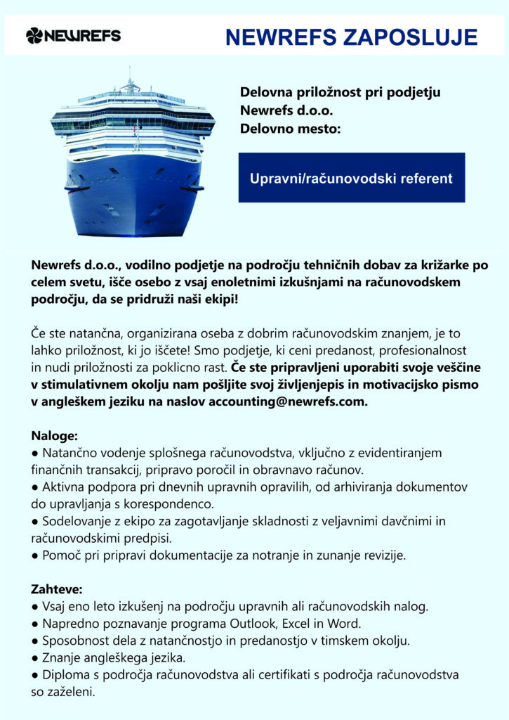 Delovna priložnost pri podjetju Newrefs d.o.o. Delovno mesto: upravni/računovodski referent Newrefs d.o.o., vodilno podjetje na področju tehničnih dobav za križarke